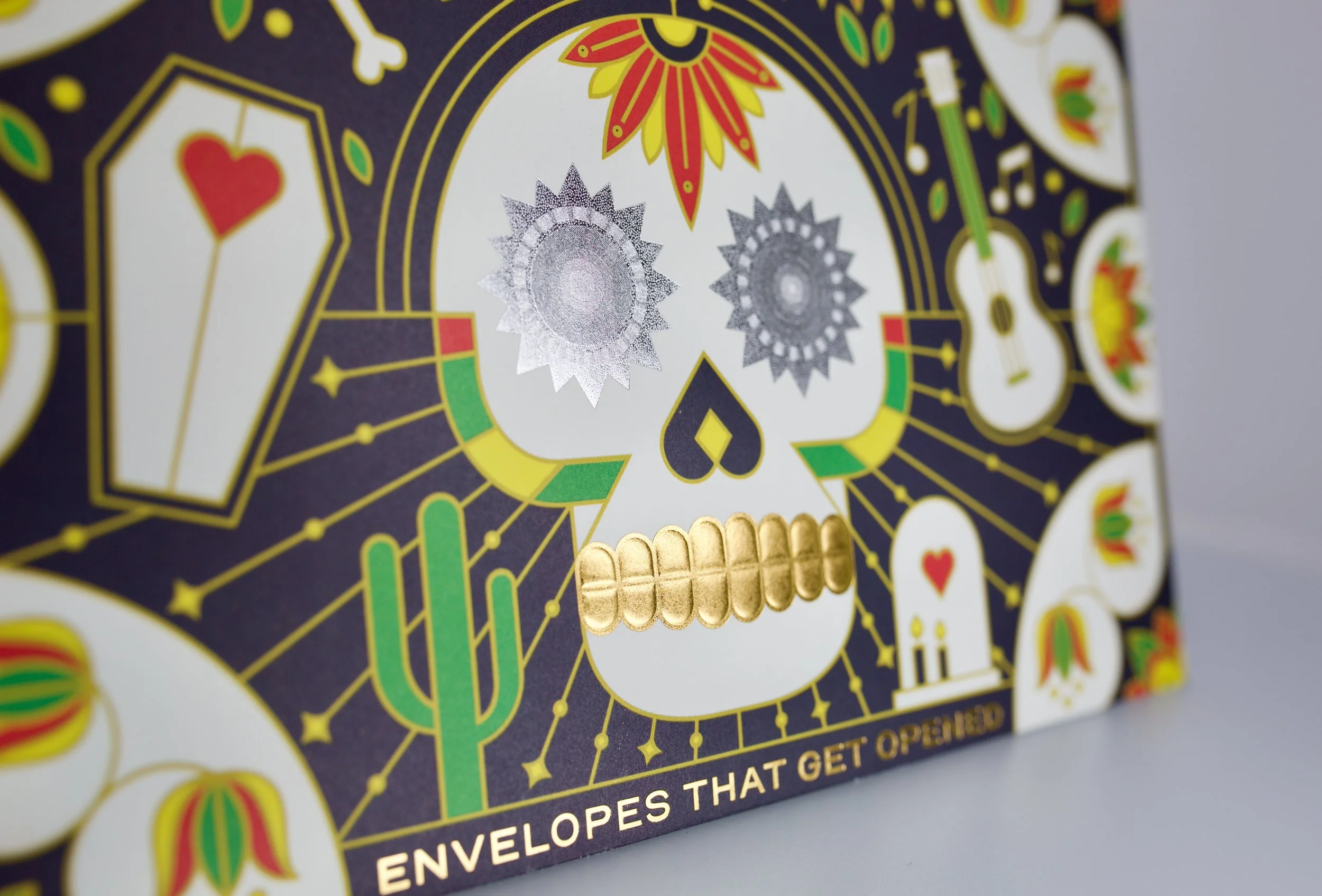 Day of The DeadSubstrate: 65# Opaque Cover Inks: 4CP Litho Enhancement #1: Silver Foil w/ Micro-Emboss Movement Patterns Enhancement #2: Gold Foil w/ True Emboss & Micro-Emboss